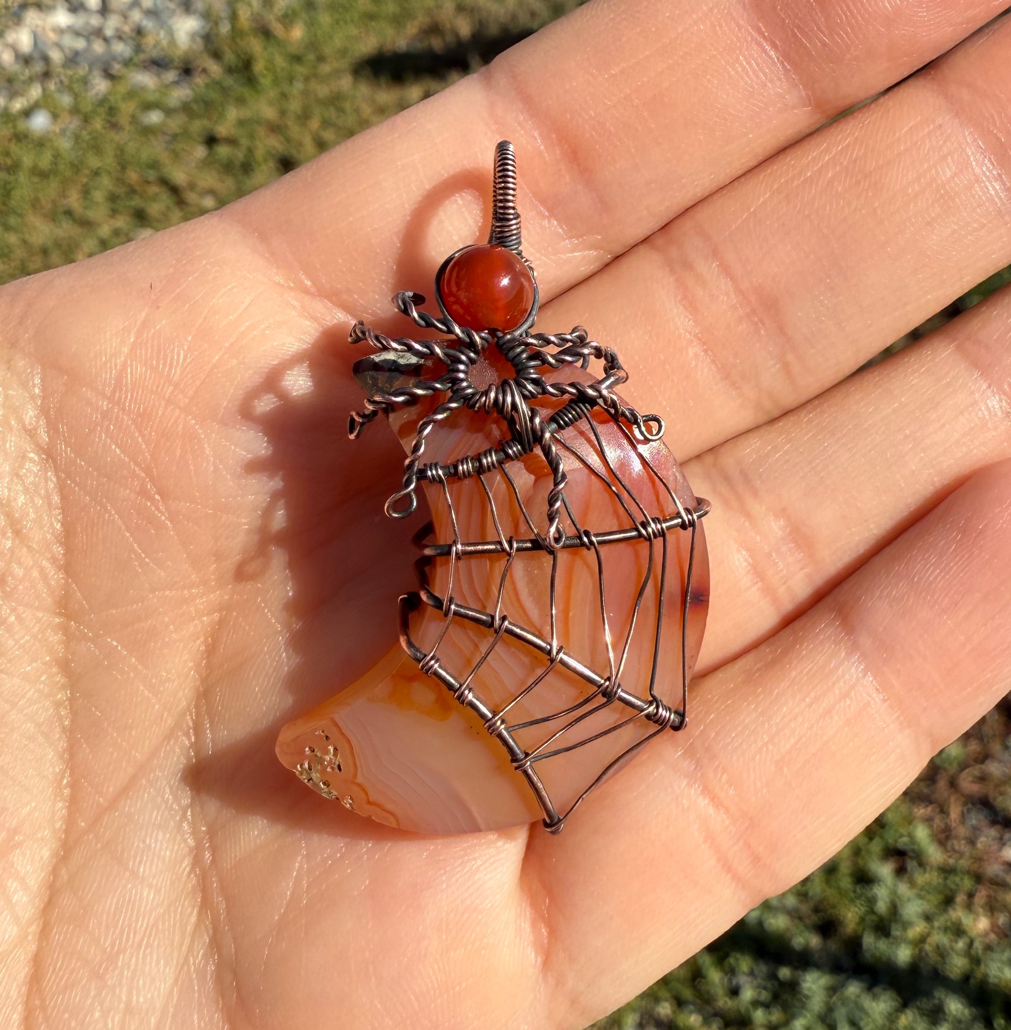 Wrapped in copper wire that has been oxidized to give this antiqued finish. The spider accent is wrapped with a carnelian bead. Perfect for fall!