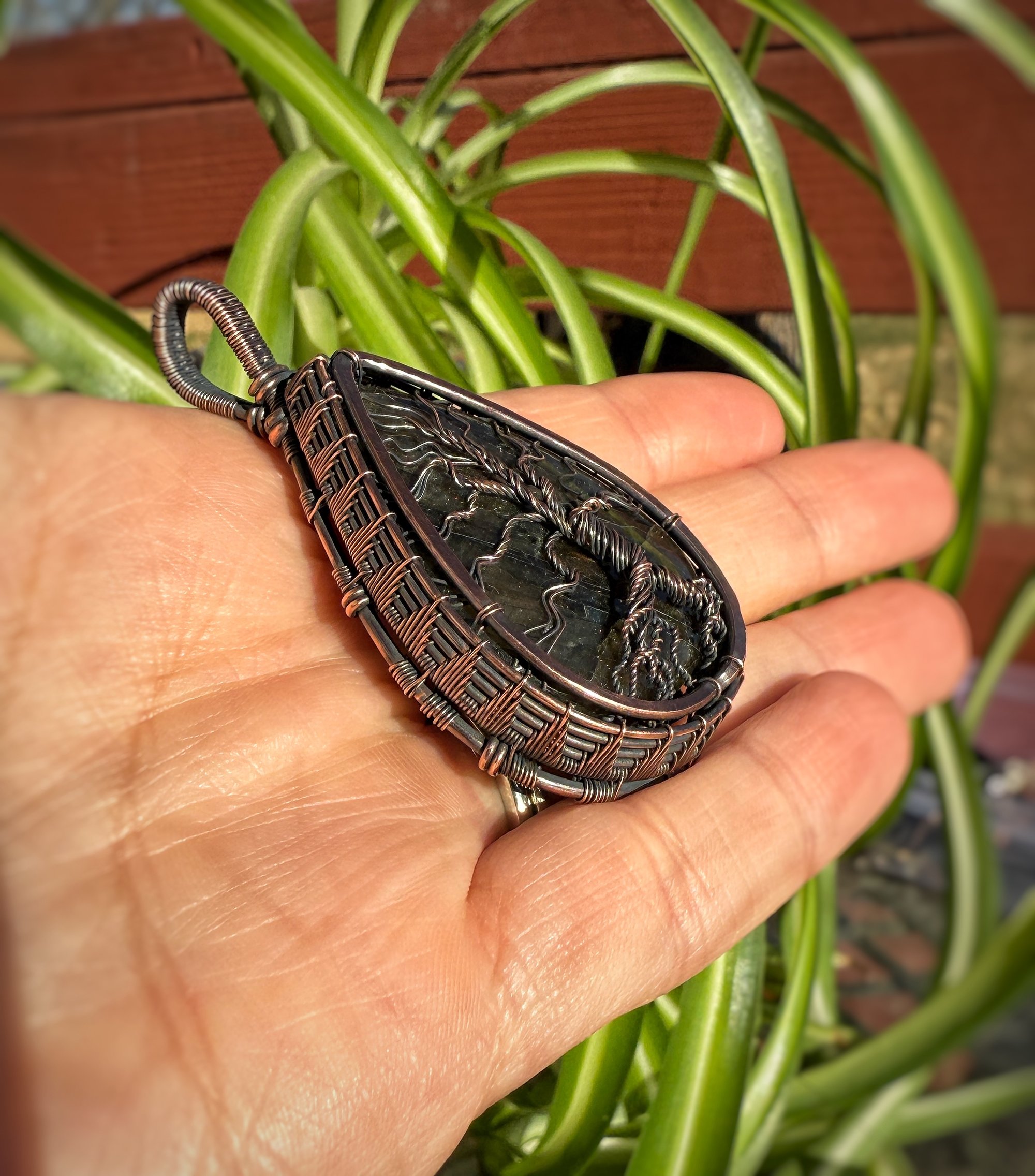 A beautiful piece of high quality labradorite wrapped in copper wire that has been oxidized to give that antiqued finish. This piece I made resembles the beautiful Aurora Borealis that was visible in the sky in early November 2025! Nature is a beautiful thing! Comes with an adjustable black cord necklace.
